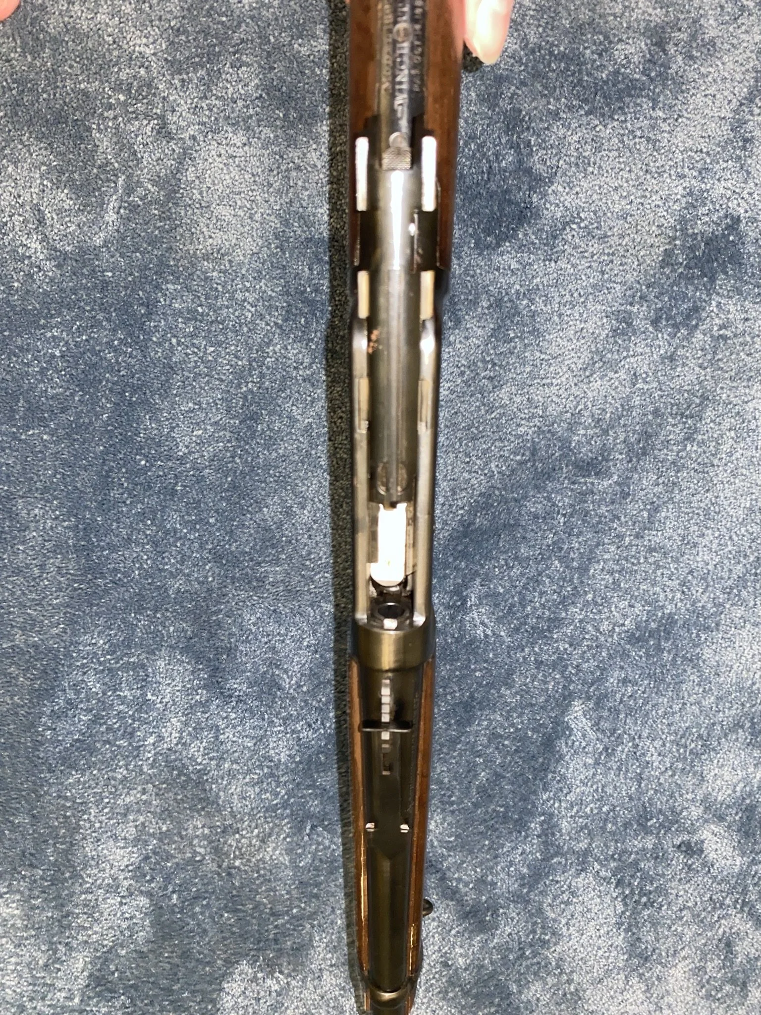 Stock: Original walnut with straight grip and crescent buttplate – period wear and handling marks visible